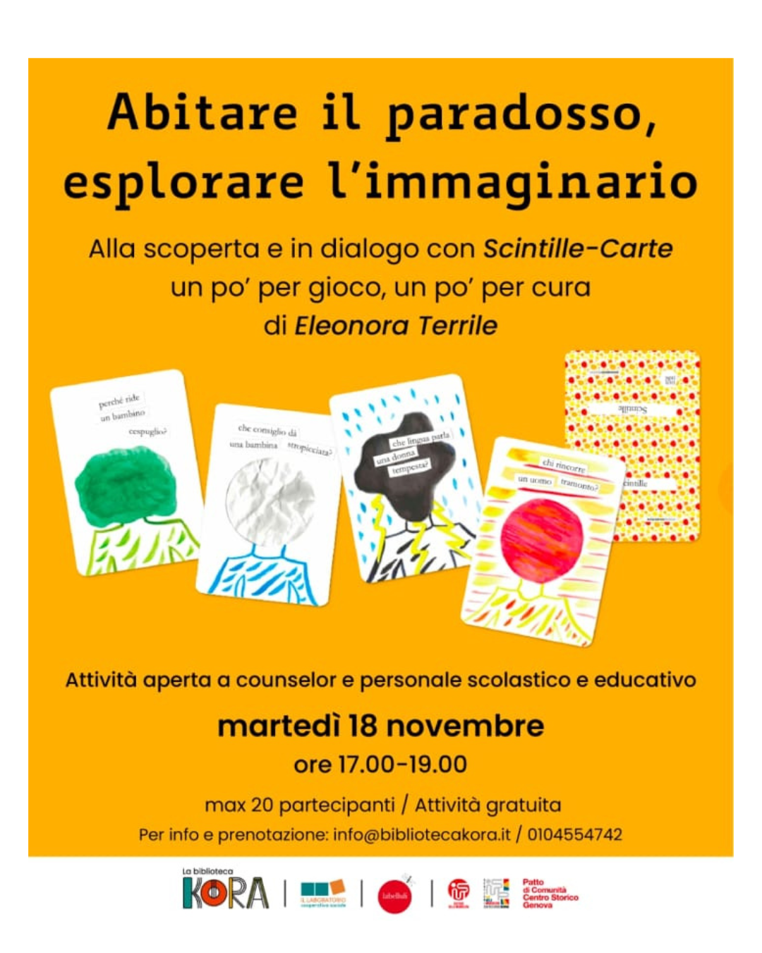 Martedì 18 Novembre, dalle 17.00 alle 19.00, la Biblioteca Kora ospiterà un workshop di Eleonora Terrile con la nuova edizione delle Carte Scintille pubblicate da Animamundi edizioni insieme a un libro di carattere scientifico-pedagogico.